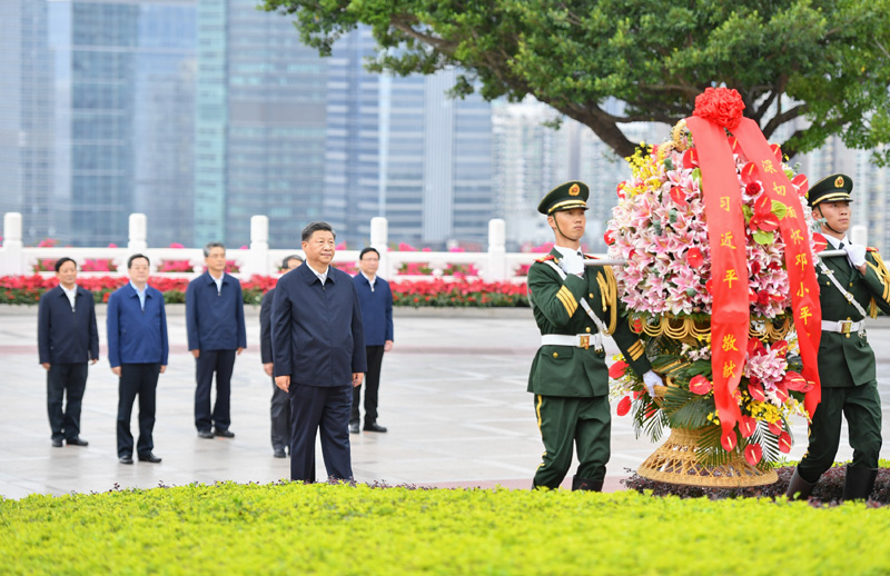 当天下午,习近平来到莲花山公园,向邓小平同志铜像敬献花篮。习近平缓步走上铜像基座,仔细整理花篮上的红色缎带,同大家一起向铜像三鞠躬,表达对邓小平同志的崇高敬意和深切缅怀。